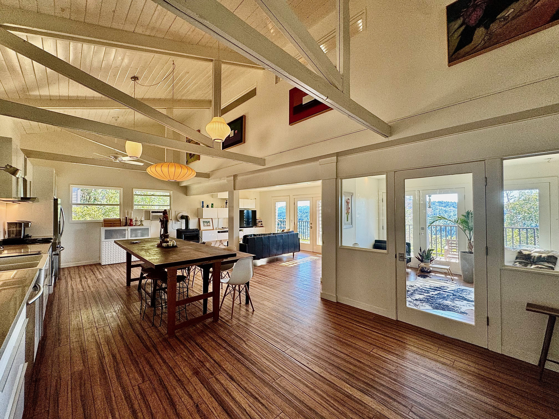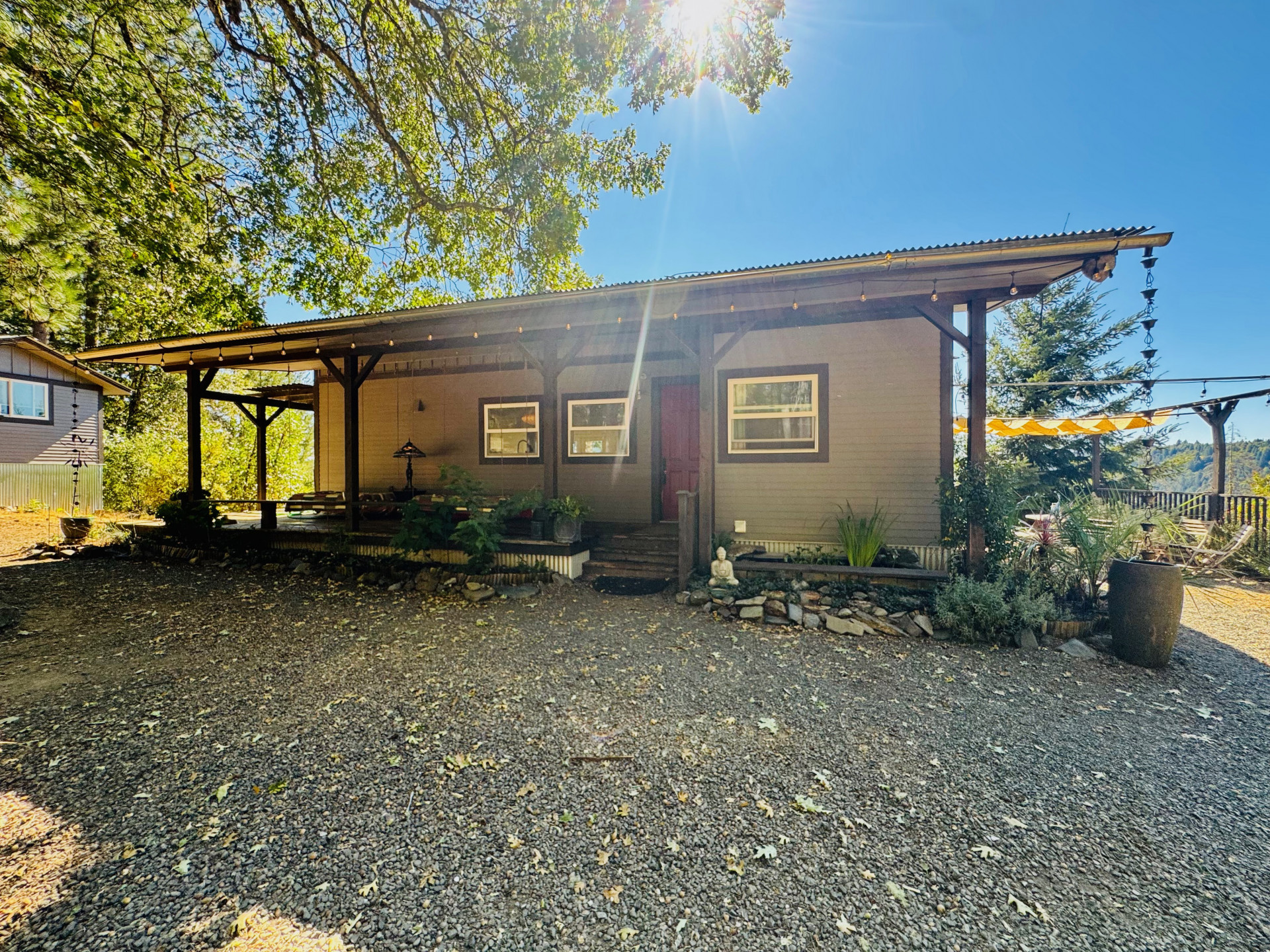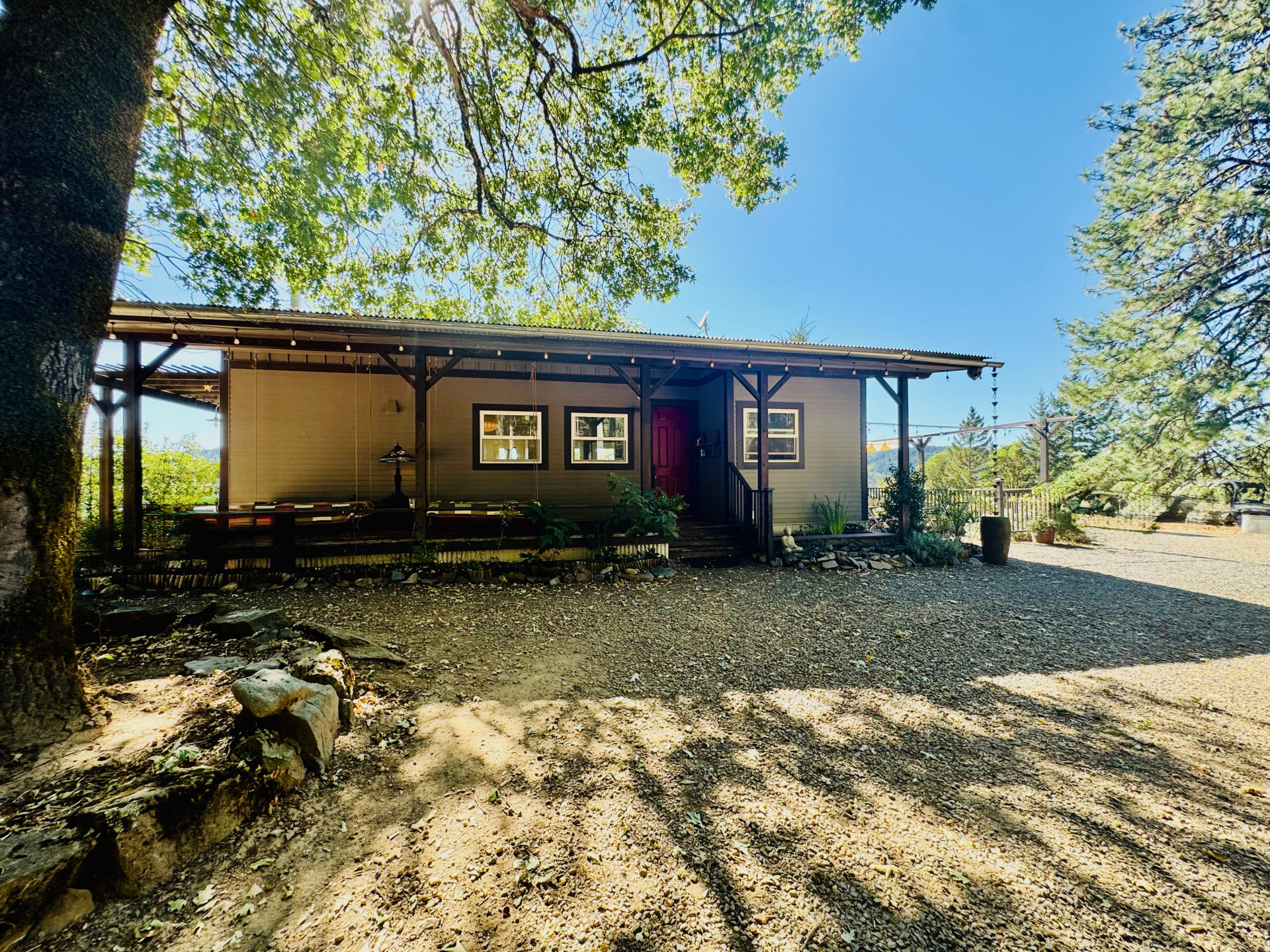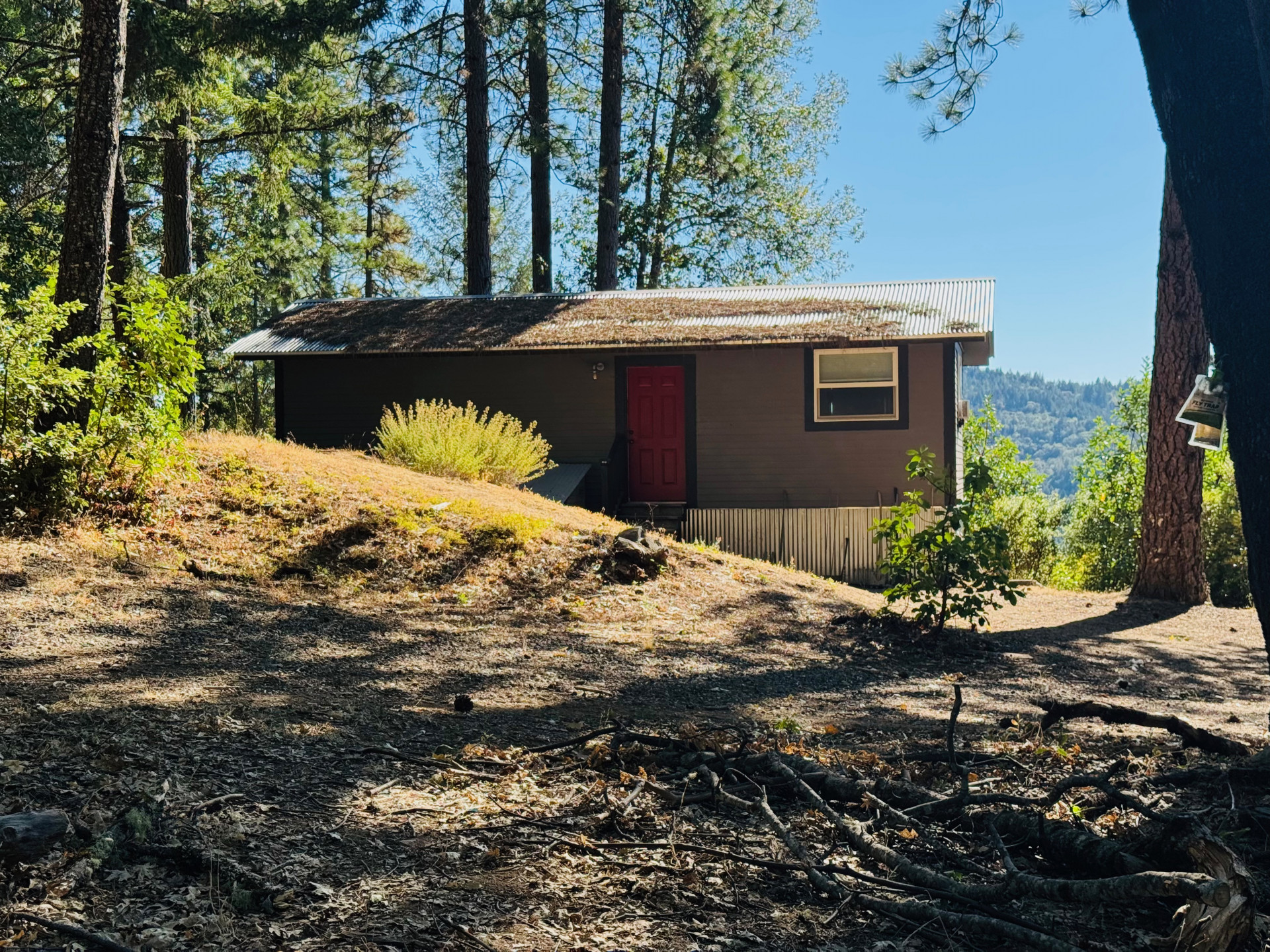 Perched on a ridge with sweeping valley views, this two-bedroom, two-bath cabin is designed for true self-sufficiency. Powered by a full solar system with backup propane generator, supplemented by woodstove heat and an energy-efficient appliance package, the home offers complete off-grid independence without sacrificing comfort. The great room features vaulted open-beam ceilings, floor-to-ceiling windows, and seamless flow between kitchen, dining, and living areas. A wraparound redwood deck frames the panoramic views. The kitchen includes a Viking range, stainless steel appliances, and quartz counters. Bathrooms feature custom tile, with the primary suite upstairs offering a Japanese soaking tub. Bamboo flooring throughout.