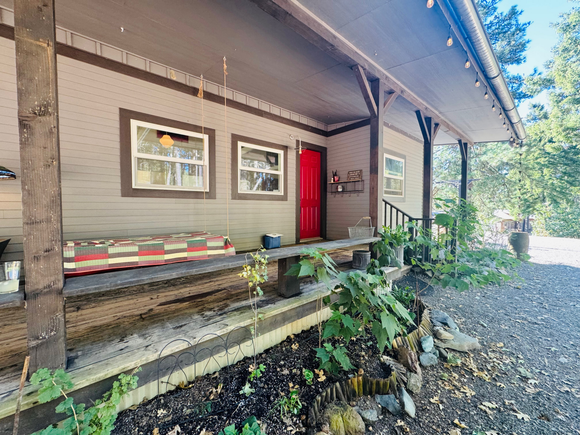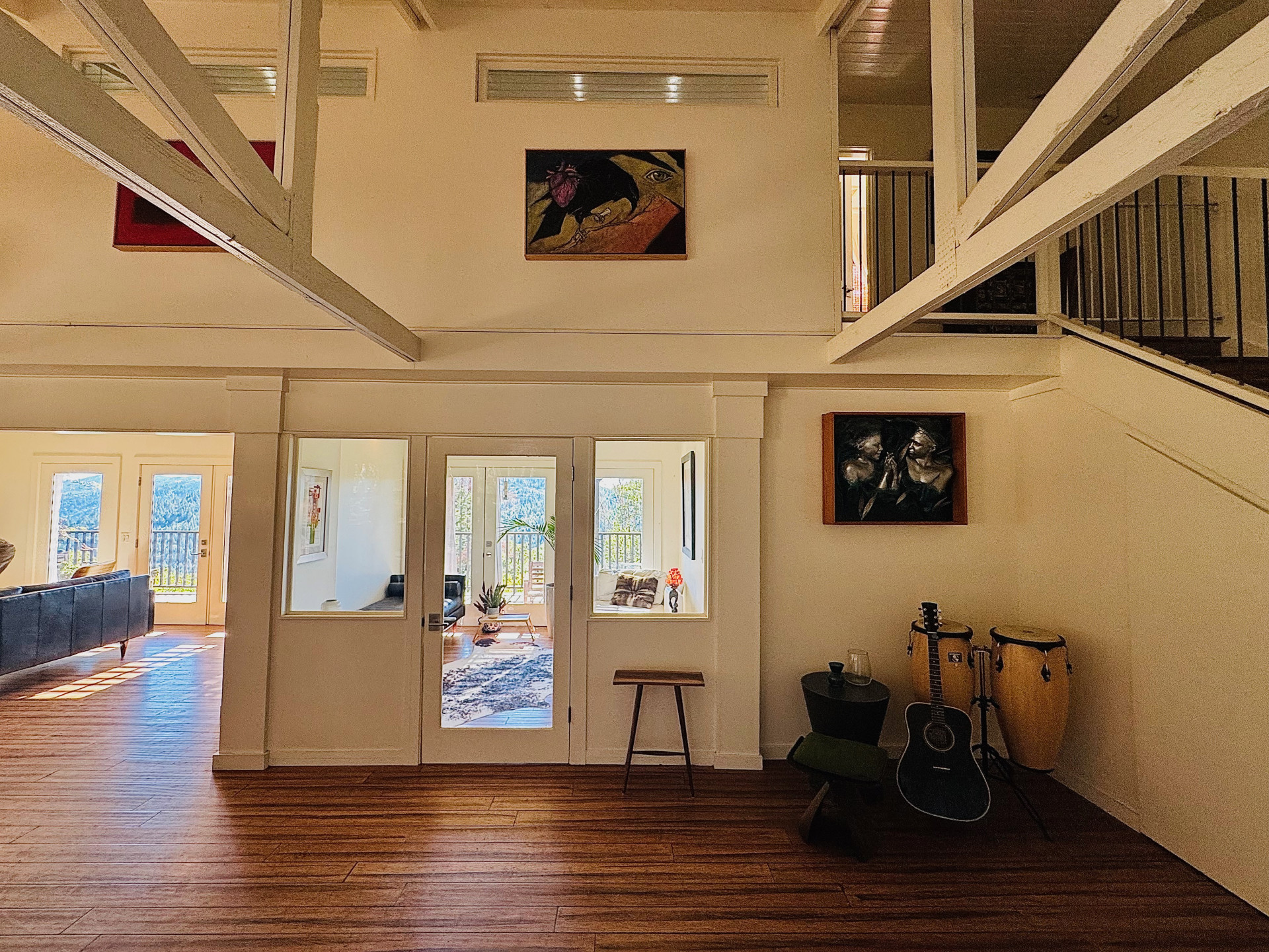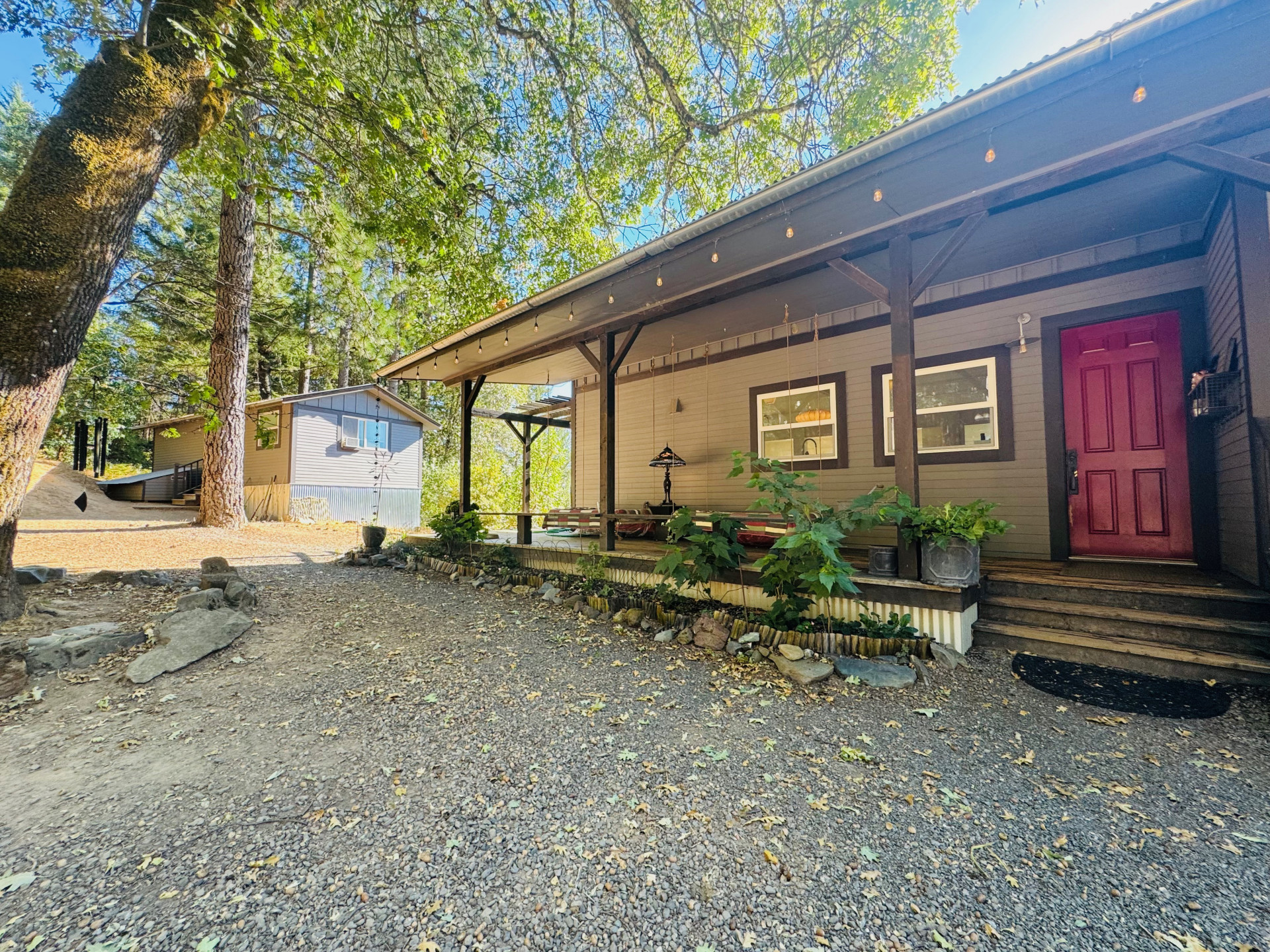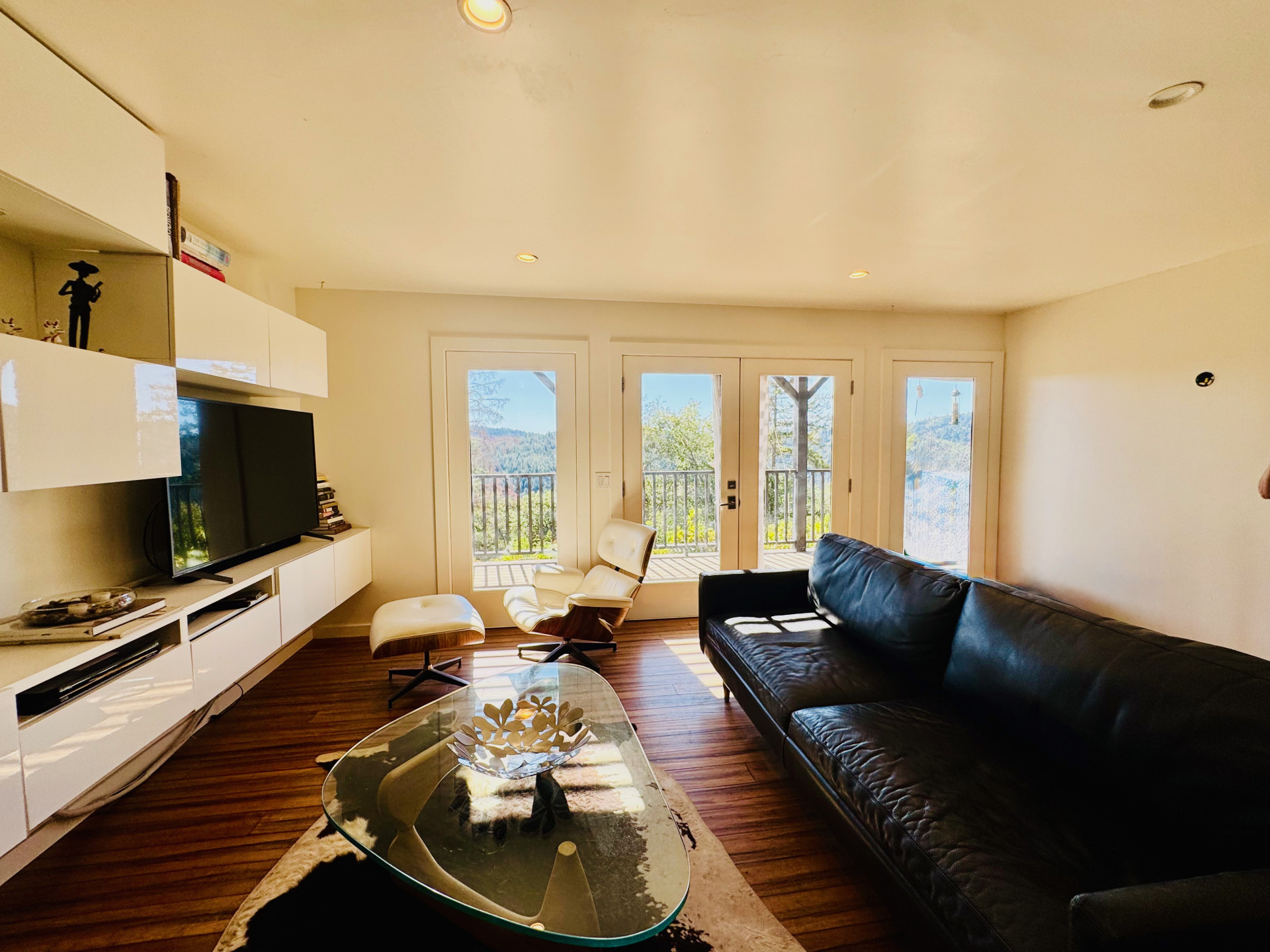 Perched on a ridge with sweeping valley views, this two-bedroom, two-bath cabin is designed for true self-sufficiency. Powered by a full solar system with backup propane generator, supplemented by woodstove heat and an energy-efficient appliance package, the home offers complete off-grid independence without sacrificing comfort. The great room features vaulted open-beam ceilings, floor-to-ceiling windows, and seamless flow between kitchen, dining, and living areas. A wraparound redwood deck frames the panoramic views. The kitchen includes a Viking range, stainless steel appliances, and quartz counters. Bathrooms feature custom tile, with the primary suite upstairs offering a Japanese soaking tub. Bamboo flooring throughout.