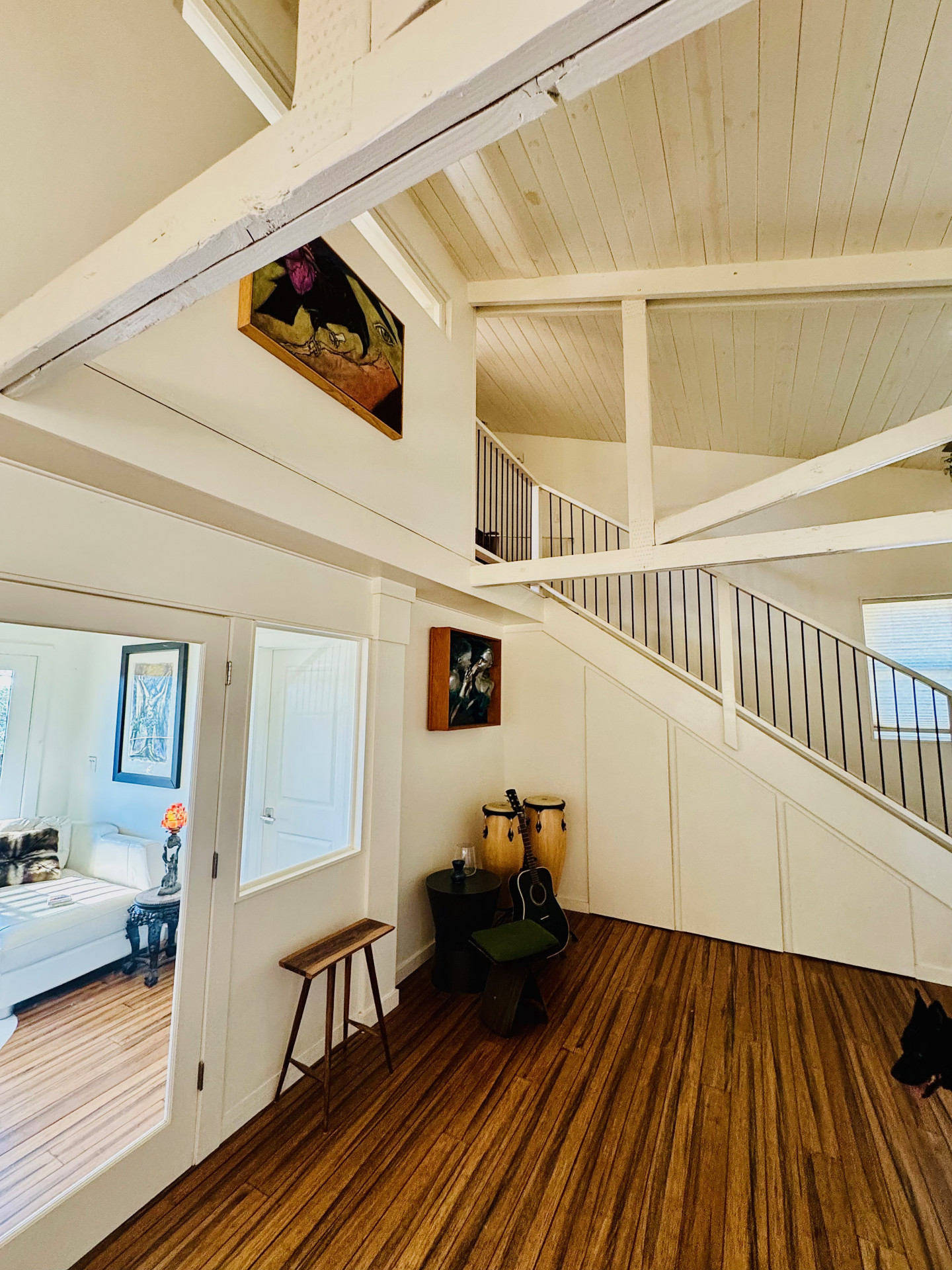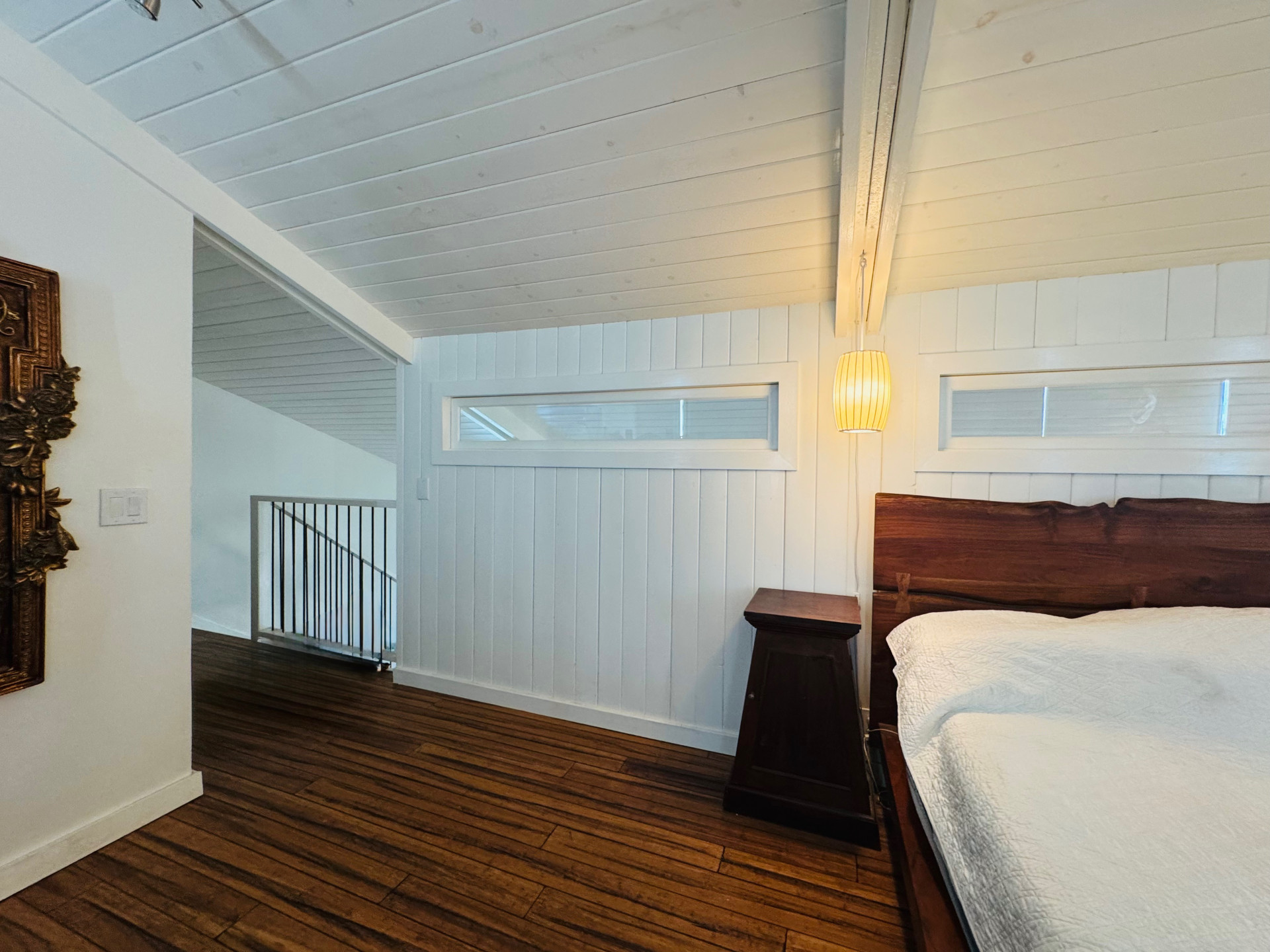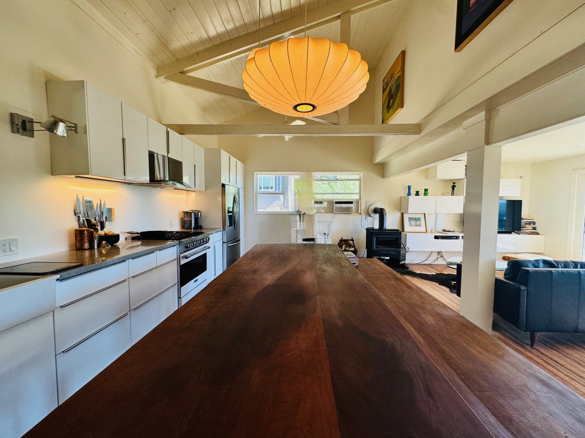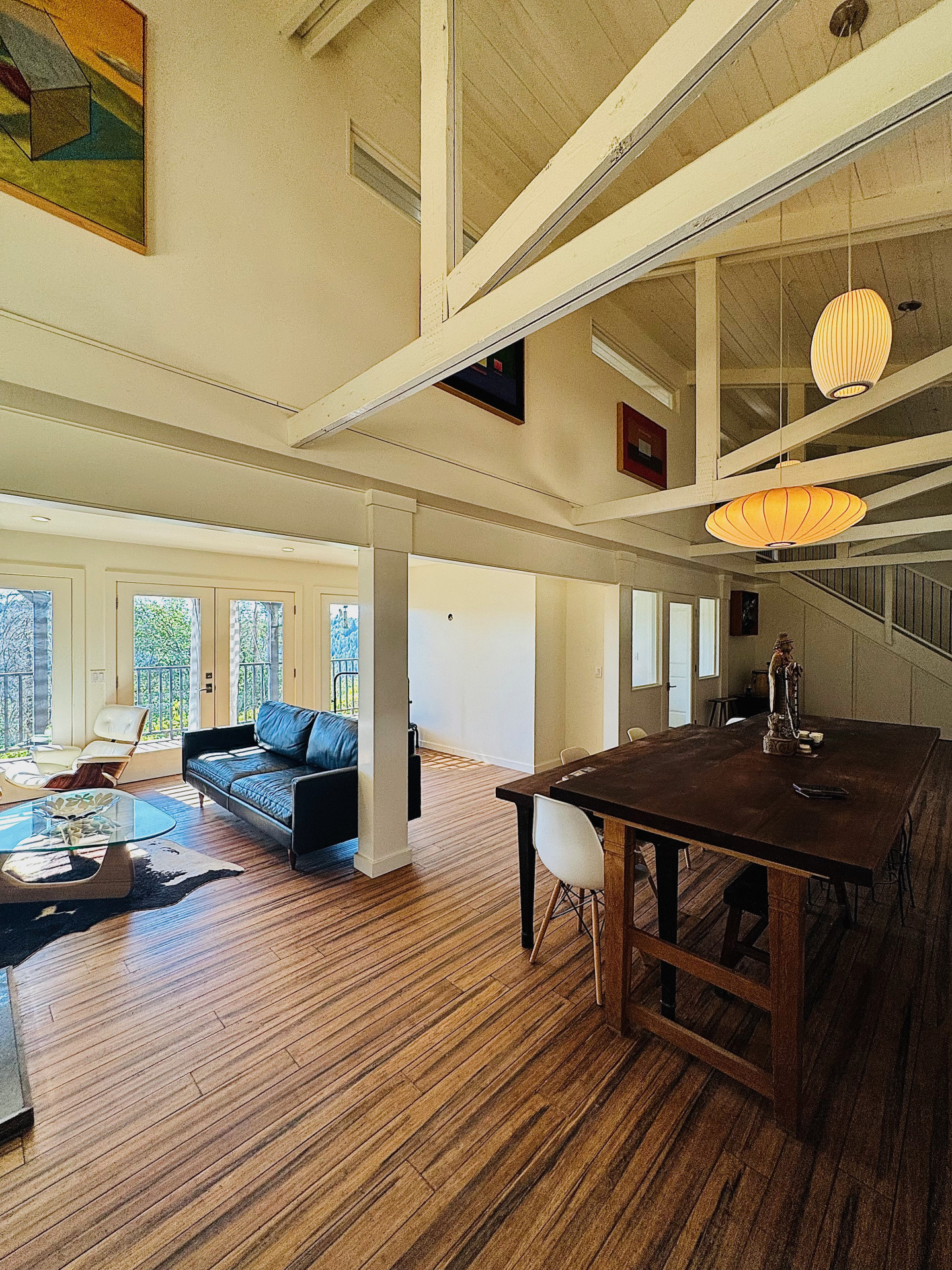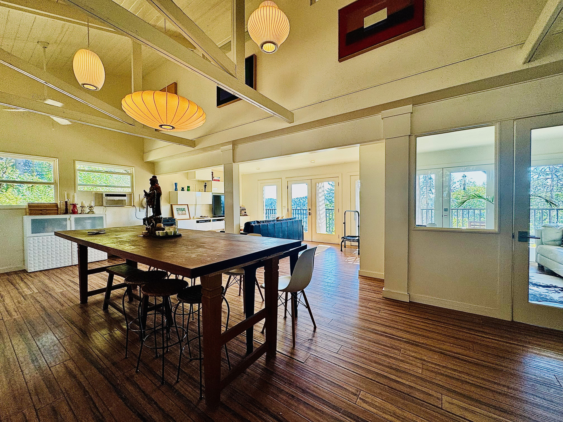 Perched on a ridge with sweeping valley views, this two-bedroom, two-bath cabin is designed for true self-sufficiency. Powered by a full solar system with backup propane generator, supplemented by woodstove heat and an energy-efficient appliance package, the home offers complete off-grid independence without sacrificing comfort. The great room features vaulted open-beam ceilings, floor-to-ceiling windows, and seamless flow between kitchen, dining, and living areas. A wraparound redwood deck frames the panoramic views. The kitchen includes a Viking range, stainless steel appliances, and quartz counters. Bathrooms feature custom tile, with the primary suite upstairs offering a Japanese soaking tub. Bamboo flooring throughout.