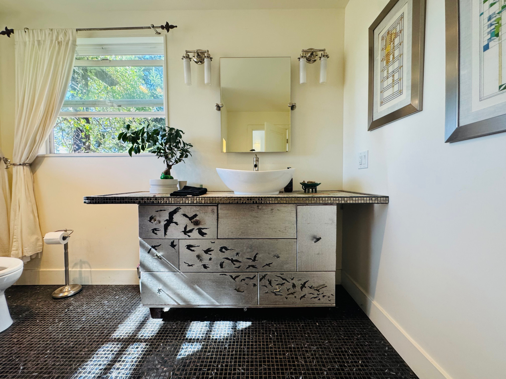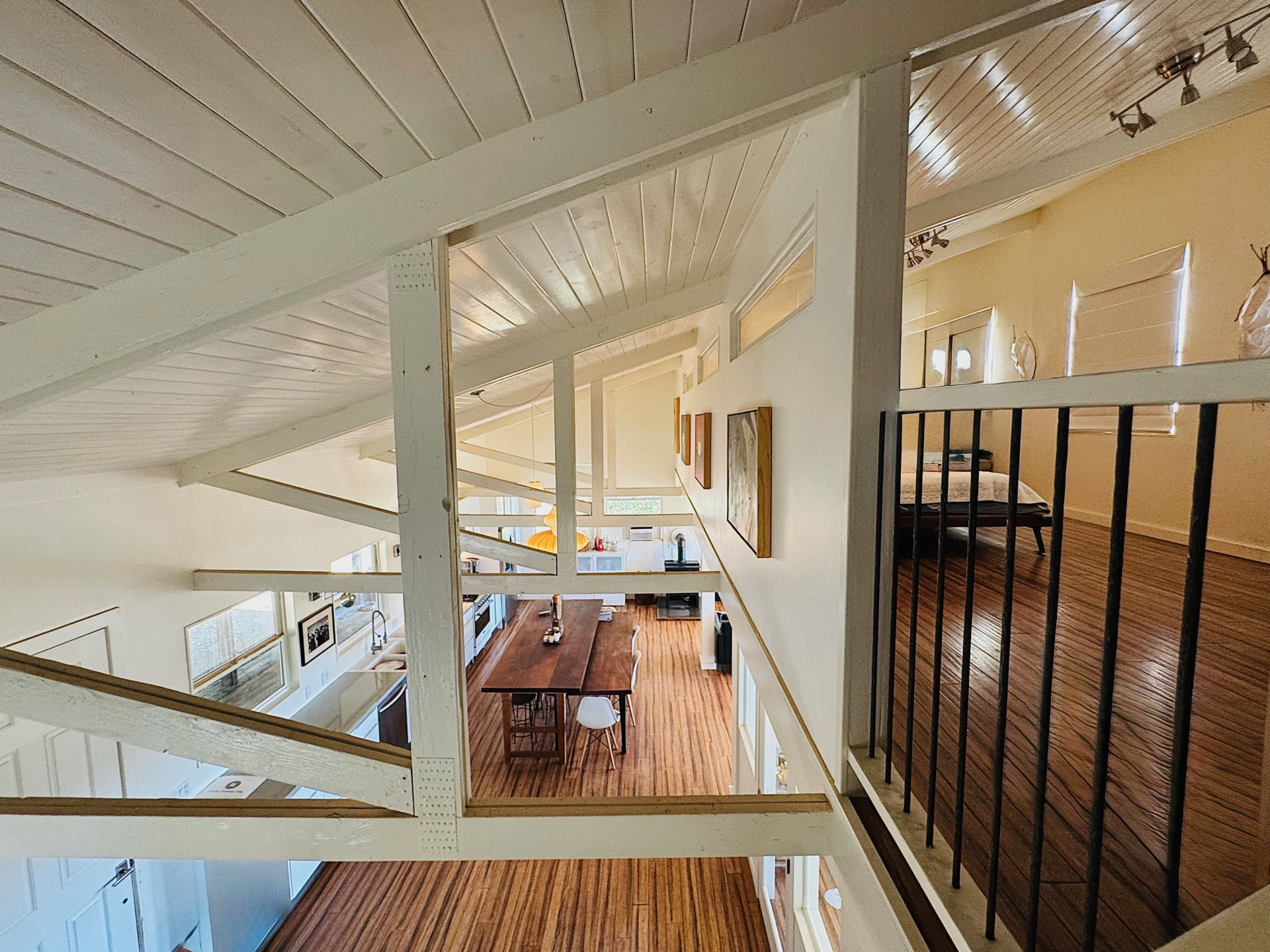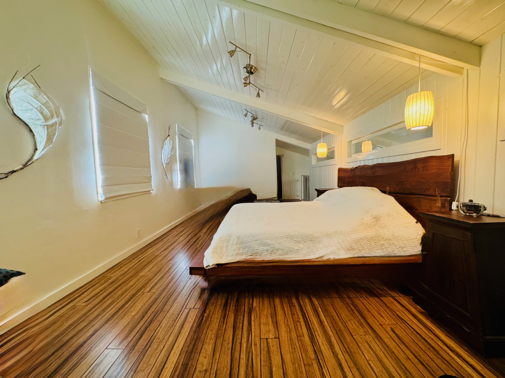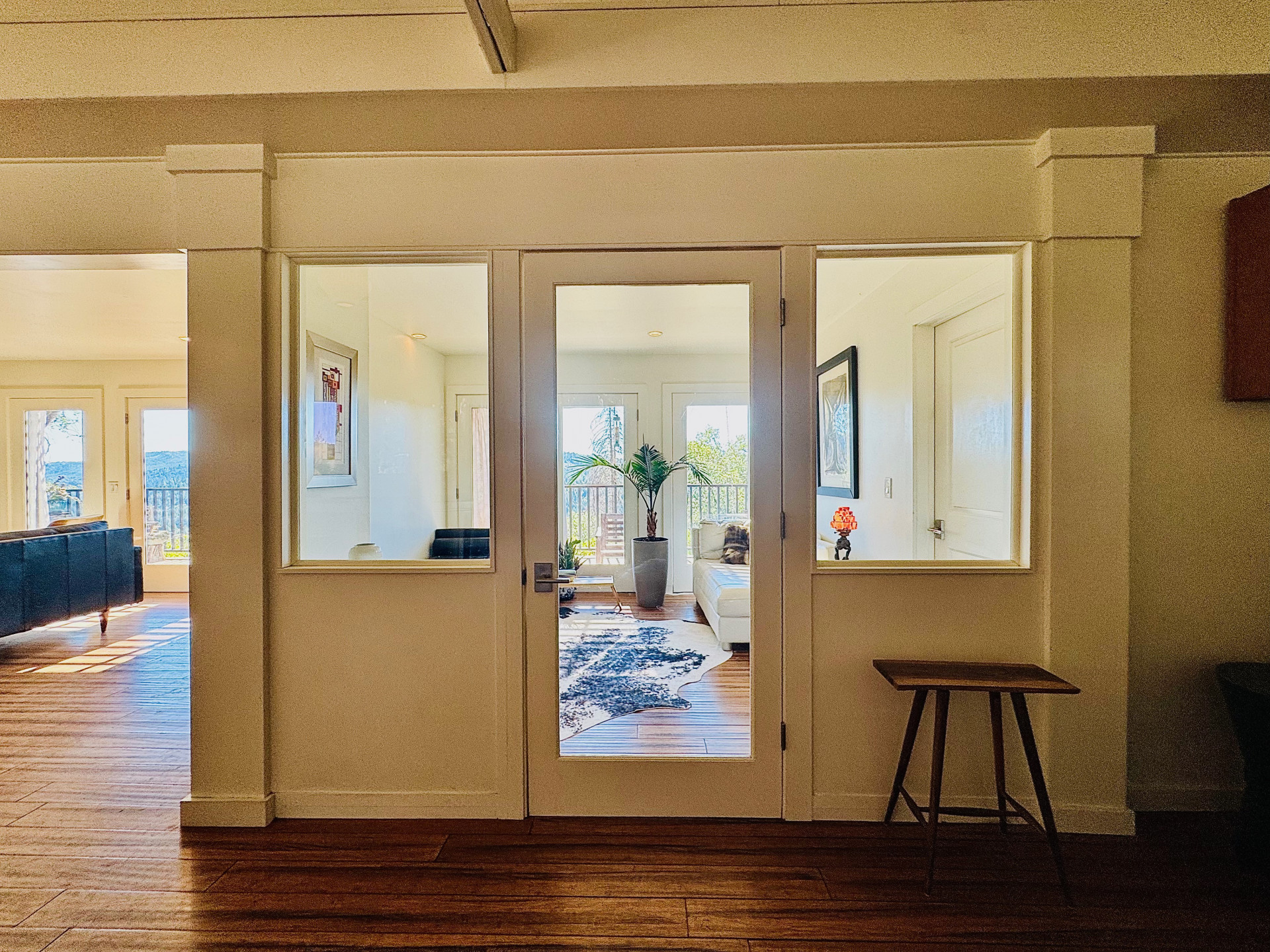 Perched on a ridge with sweeping valley views, this two-bedroom, two-bath cabin is designed for true self-sufficiency. Powered by a full solar system with backup propane generator, supplemented by woodstove heat and an energy-efficient appliance package, the home offers complete off-grid independence without sacrificing comfort. The great room features vaulted open-beam ceilings, floor-to-ceiling windows, and seamless flow between kitchen, dining, and living areas. A wraparound redwood deck frames the panoramic views. The kitchen includes a Viking range, stainless steel appliances, and quartz counters. Bathrooms feature custom tile, with the primary suite upstairs offering a Japanese soaking tub. Bamboo flooring throughout.