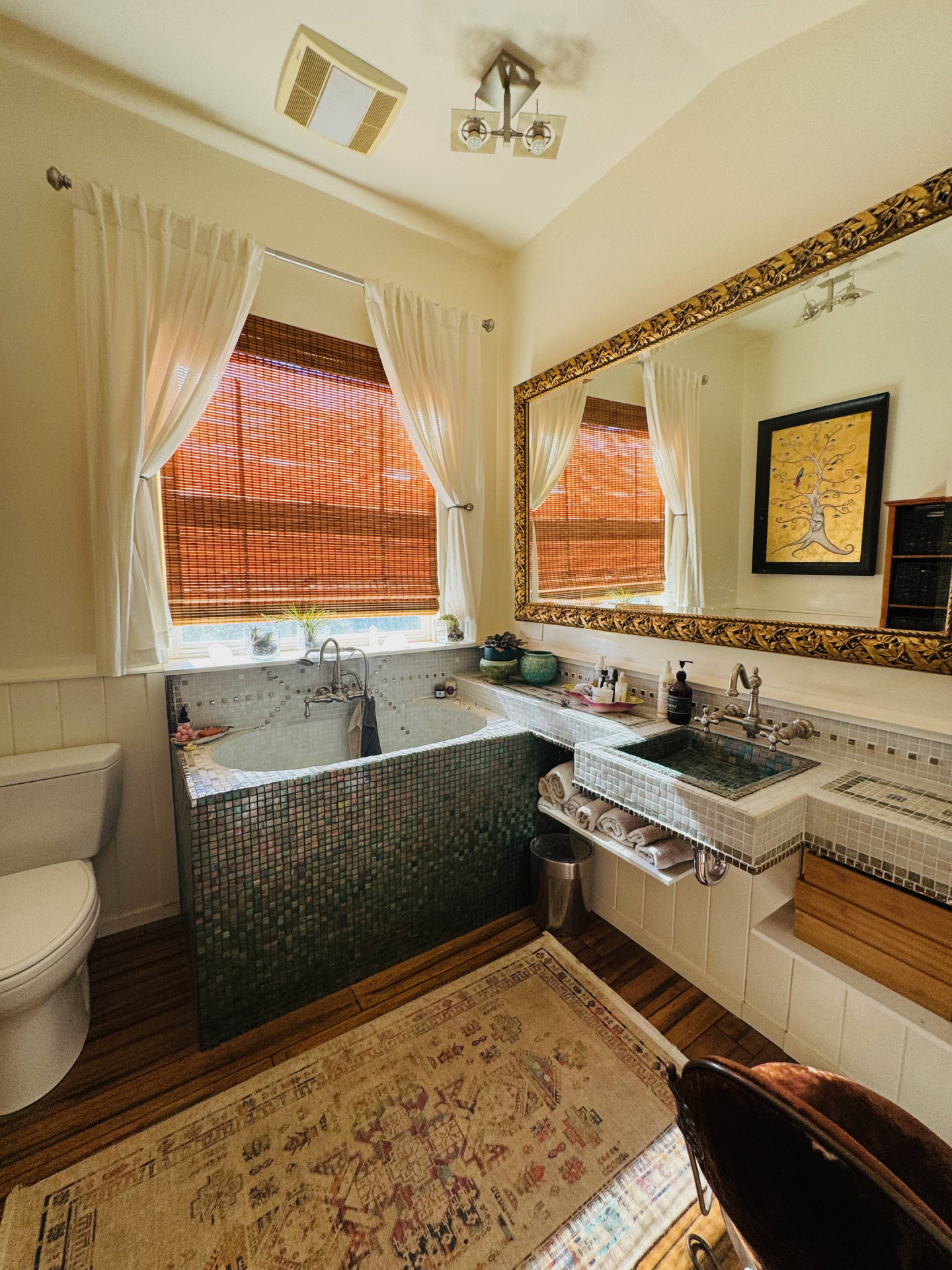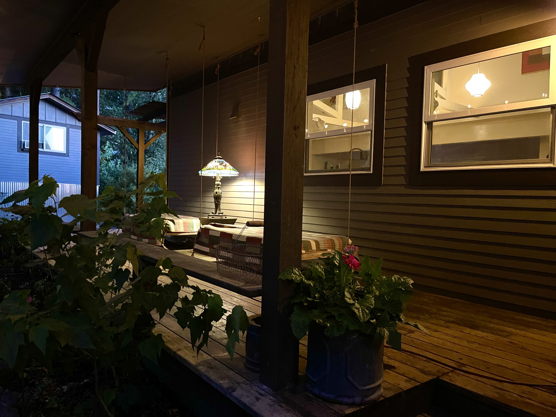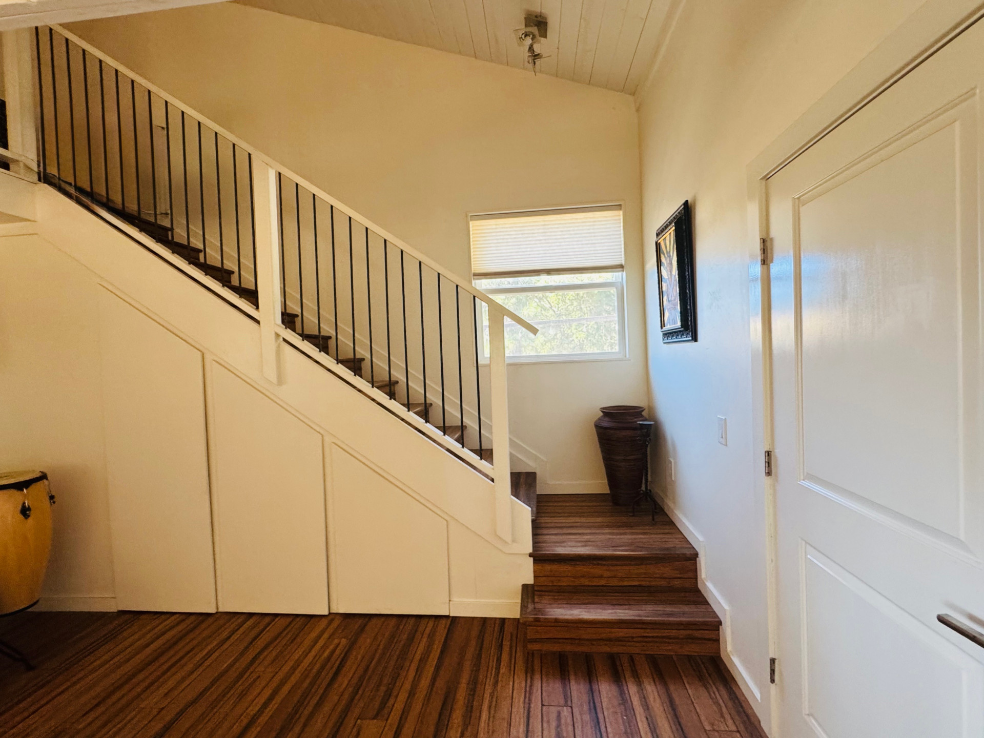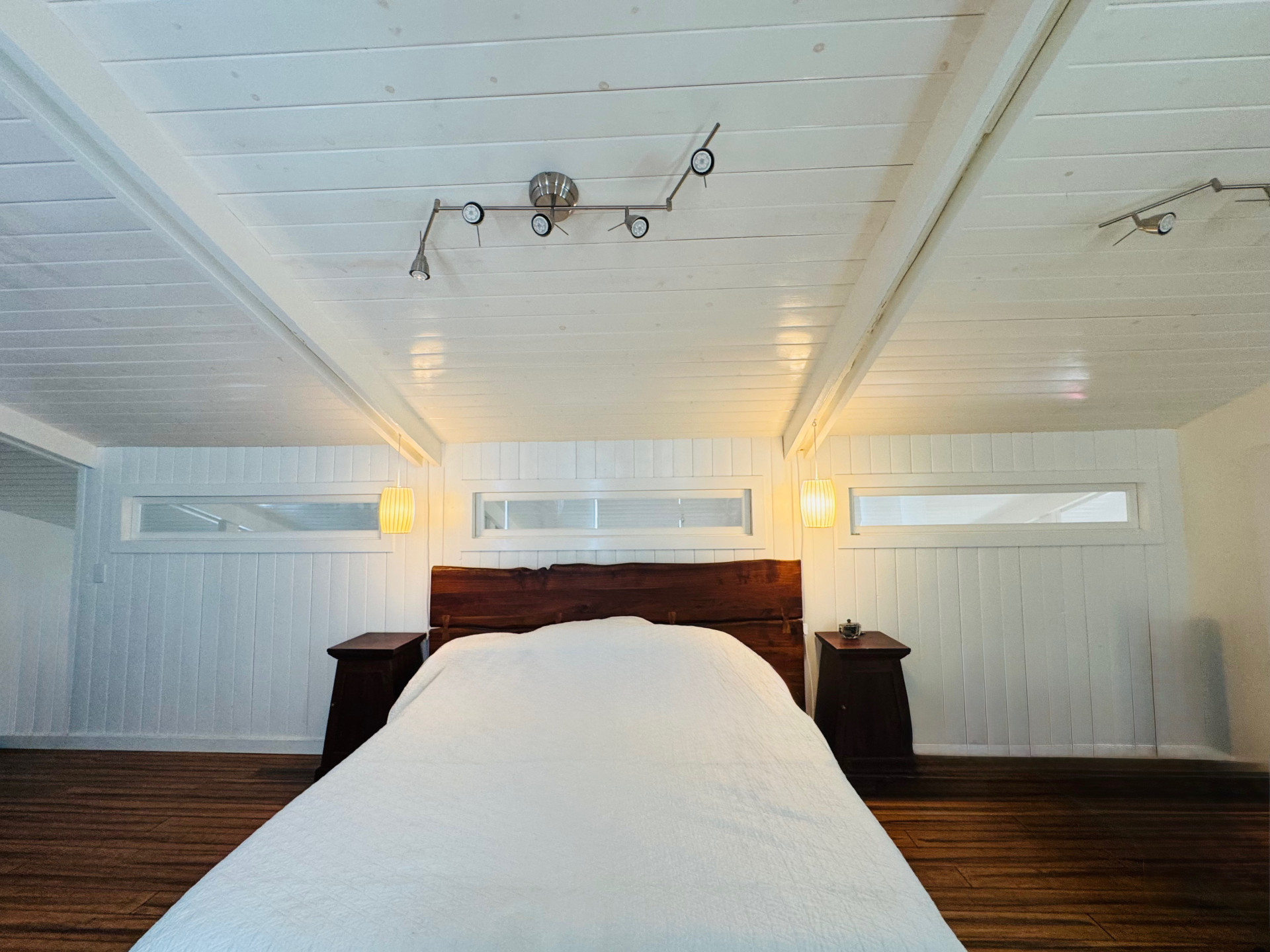 Perched on a ridge with sweeping valley views, this two-bedroom, two-bath cabin is designed for true self-sufficiency. Powered by a full solar system with backup propane generator, supplemented by woodstove heat and an energy-efficient appliance package, the home offers complete off-grid independence without sacrificing comfort. The great room features vaulted open-beam ceilings, floor-to-ceiling windows, and seamless flow between kitchen, dining, and living areas. A wraparound redwood deck frames the panoramic views. The kitchen includes a Viking range, stainless steel appliances, and quartz counters. Bathrooms feature custom tile, with the primary suite upstairs offering a Japanese soaking tub. Bamboo flooring throughout.
